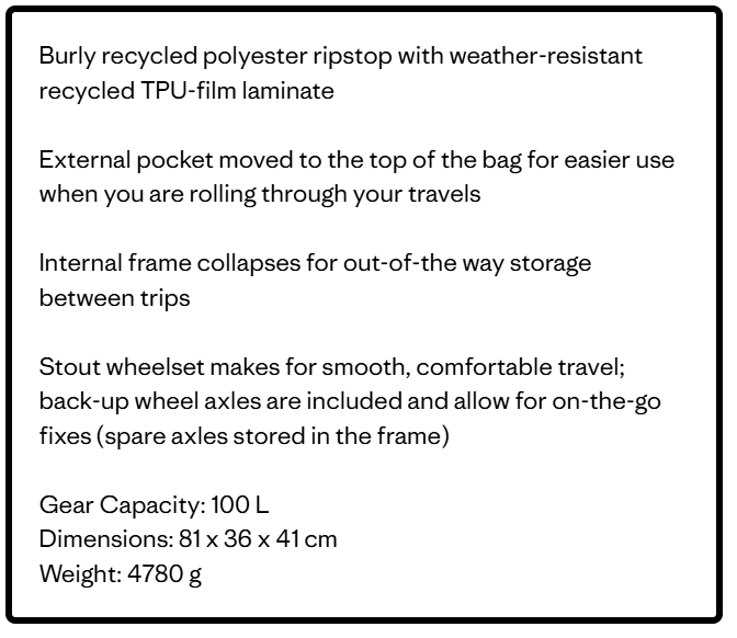 A highly weather-resistant 100-liter gear hauler with sturdy wheels and a telescoping handle. It delivers the same legendary performance you expect from our Black Hole® bags, but with a huge step toward environmental impact reduction with 100% recycled body fabric, lining and webbing, and now a pioneering recycled TPU-film laminate with a sleek matte finish.